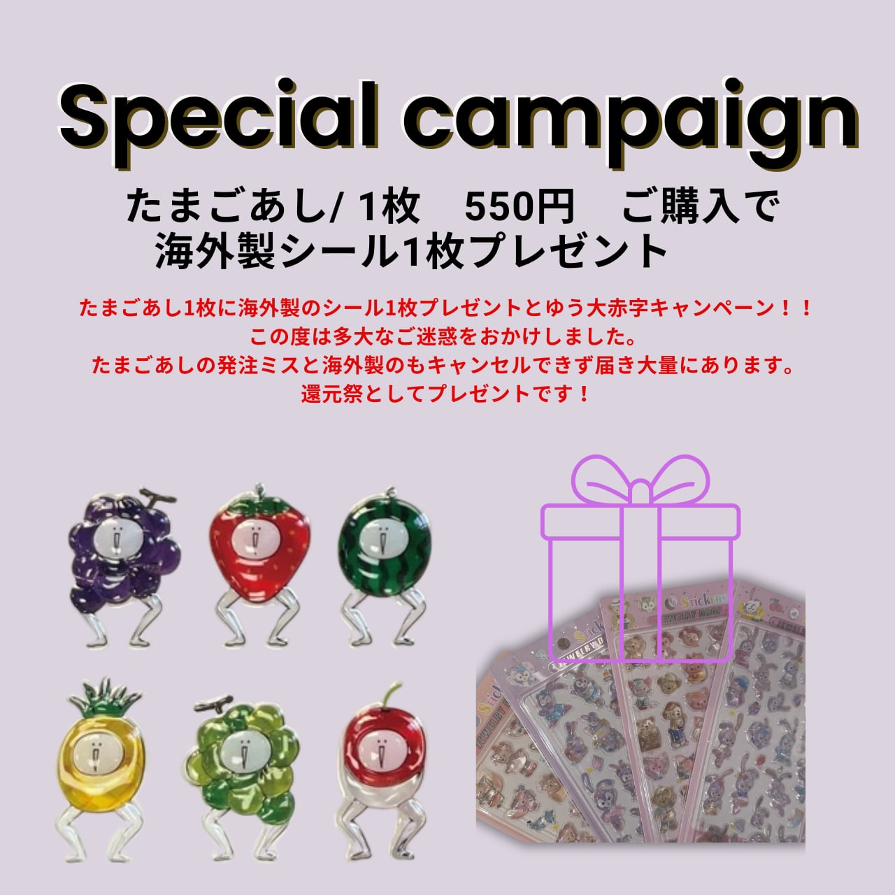 プレゼント分50円にしてたまごあしの定価分にしています。